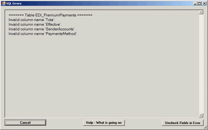 Study the errors in detail and see what went wrong. In our case, for demonstration purposes we have changed the names and that caused the error. A solution is to click the "Uncheck the Fields in Error" button and return to the field selection screen.